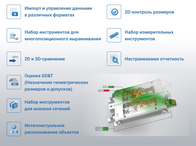 Оснащен мощными инструментами GD&T. Такая функция позволяет точно измерять диаметры объектов, позиции,ориентации, расстояния и углы между элементами. Интуитивная ЗD-визуализация обеспечивает четкое иллюстрирование для комплексного анализа.