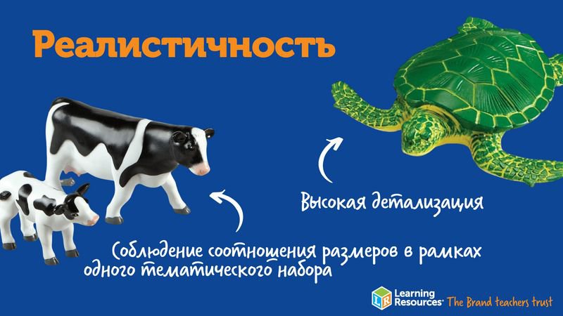 До 2 лет детям просто необходимо исследовать окружающий мир посредством тактильной чувствительности — то есть, при помощи пальчиков или языка. Не случайно малыши стремятся все тянуть в рот! Фигурки Learning Resources сделаны из экологически чистых материалов, их вполне можно изучить и таким способом — это не принесет ребенку вреда, зато доставит ему массу удовольствия. Трогая фигурки животных пальчиками и тщательно ощупывая их со всех сторон, малыши узнают много нового о внешних отличительных признаках животных и смогут развить мелкую моторику.