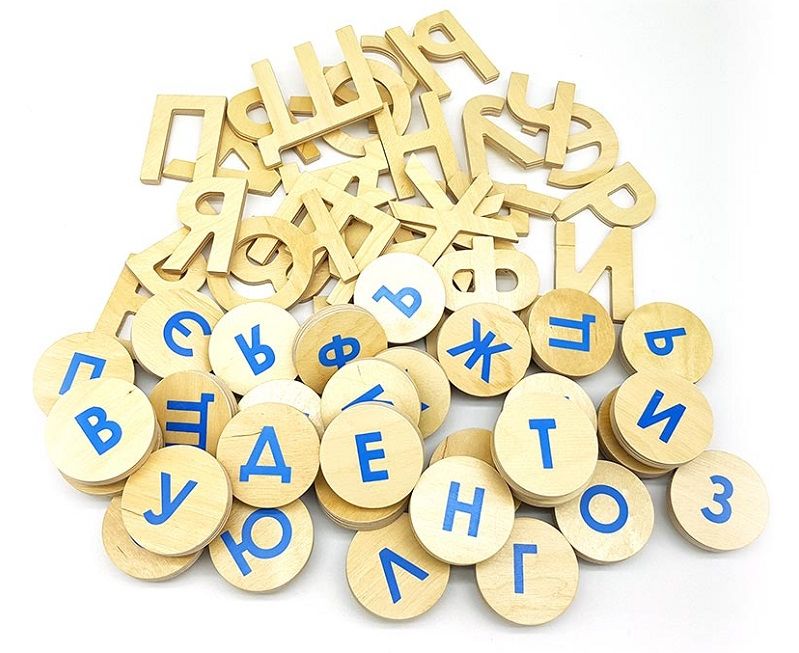 № 6) магнитные буквы славянского алфавита (Кириллицы) на деревянных кружочках и к ним большие, вырезанные из дерева объемные буквы (всего количество тех и других букв — 62).