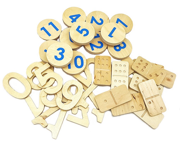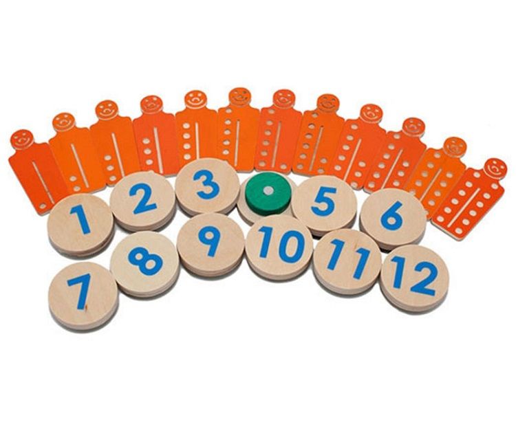 № 5) 12 цифр от 1 до 12 на магнитах и 12 их дублей без магнитов (к ним прилагаются 12 розовых счетных «человечков» с точками от 1 до 12);