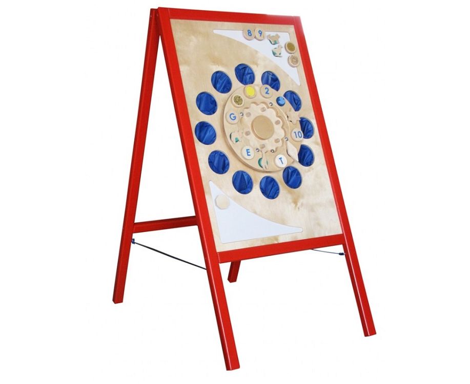 Дидактическая игра: Сенсино представляет собой деревянный напольный стенд с игровым полем, на котором размещены: крутящийся диск с перемещающимся металлическим «указателем» — шариком, 12 кружочков — магнитов для прикрепления пособий на магнитах; 12 выпиленных круглых «окошек», в которых спрятаны 12 синих «волшебных» мешочков – «тайничков»; две треугольные магнитные доски (сверху справа и снизу слева) для размещения / демонстрации снятых с диска или дополнительных дидактических материалов; пособия — 6 мешочков с помещенными в них 6 деревянными игровыми комплектами (дидактическими материалами):