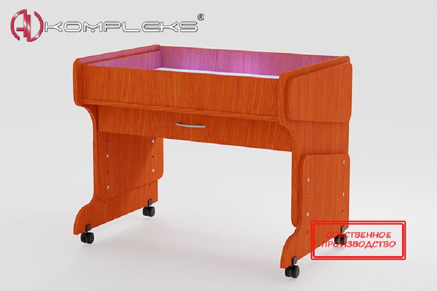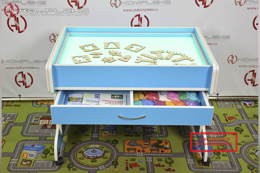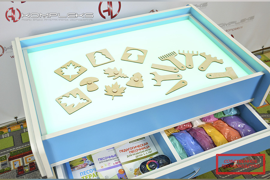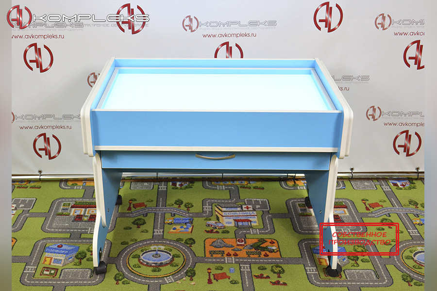 Парта совмещает в себе место для работы и песочный комплекс для игр и творчества, куда встроена подсветка RGB. При использовании игровой части можно применять не только кварцевый песок, но и кинетический.
