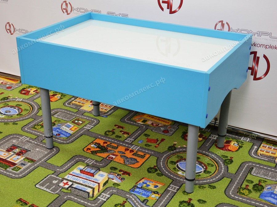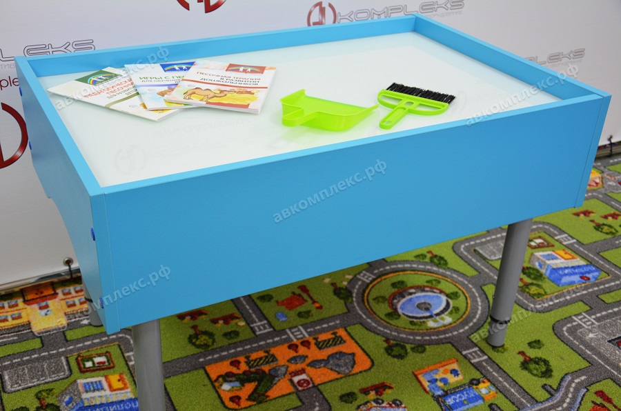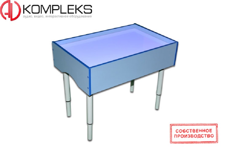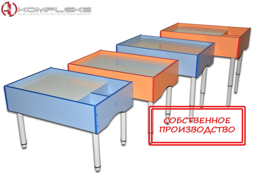Отличие стола от планшета заключается в наличии четырех телескопических опор, позволяющие фиксировать его высоту при помощи винта. Размер рабочей поверхности может быть, как 748х468 мм, так и 550х468 мм. Также имеются отделения для песка, плюс ко всему сам кварцевый песок, мини щетка с совком и RGB лента белая, на метр которой приходится по 60 светодиодов. Стекло в составе используется обязательно закаленное и покрытое транслюцентной пленкой.