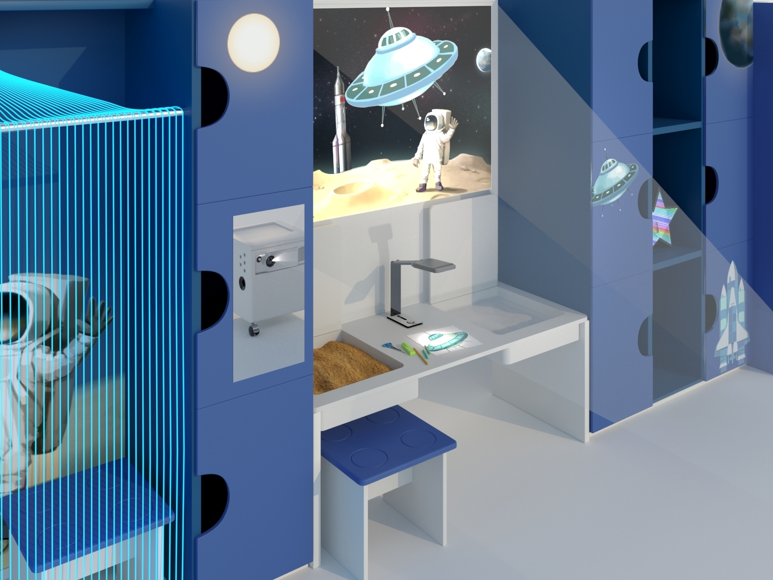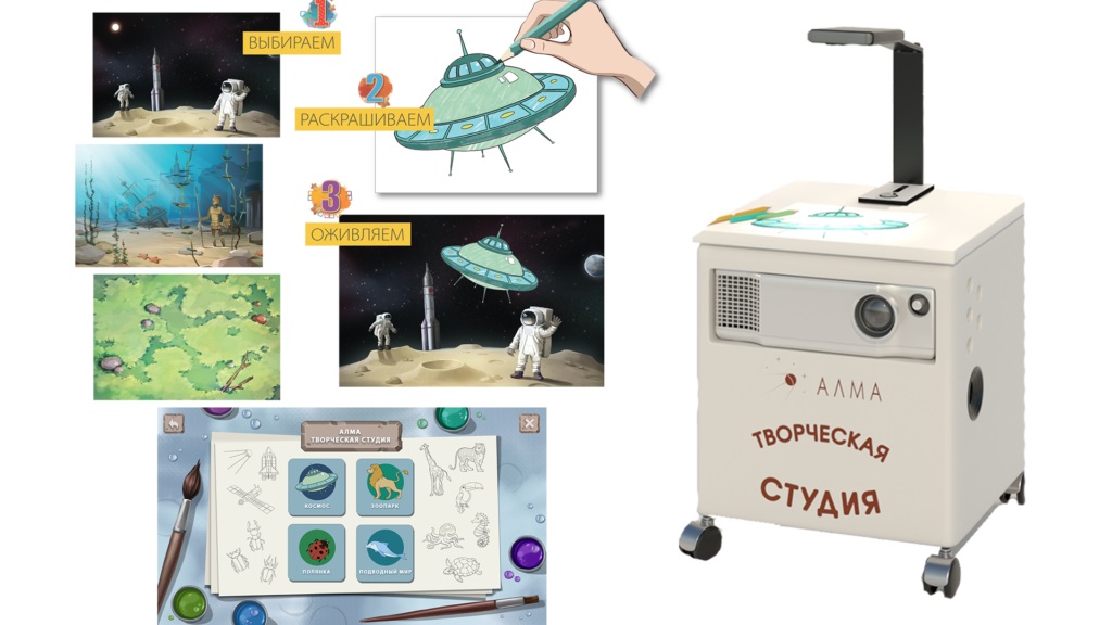 В комплекте с творческой студией имеются макеты рисунков на разные тематики: "В космосе", "Зоопарк", "Полянка", "Подводный мир" (более 30 штук). Помимо традиционных инструментов в состав комплекса входят современные компоненты, которые помогают педагогу разнообразить занятия с детьми.