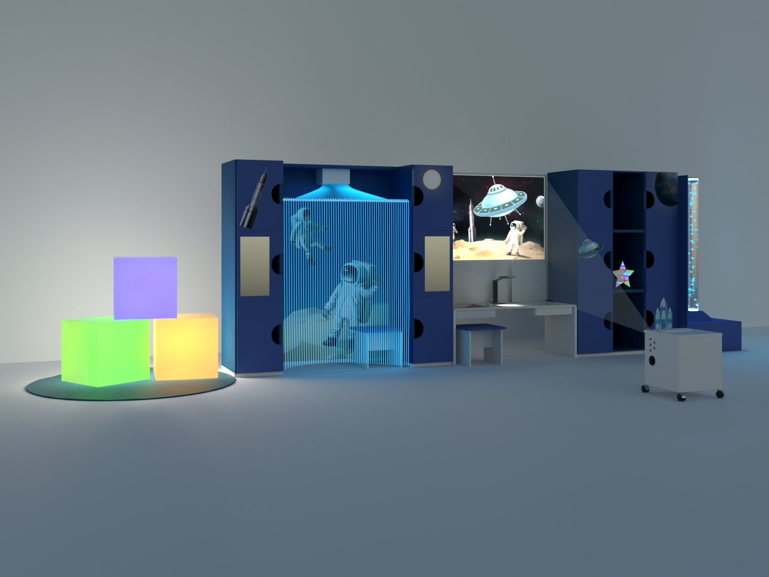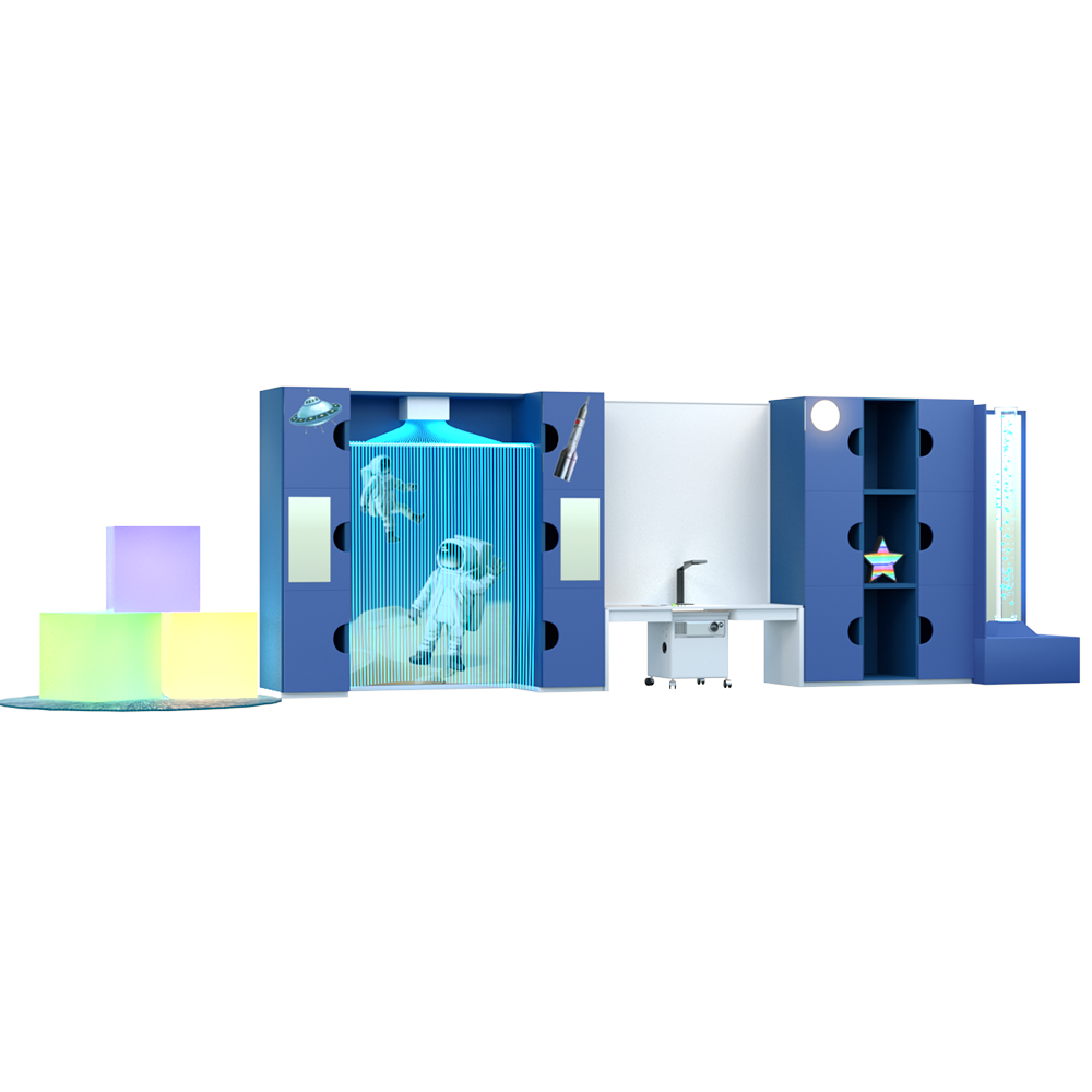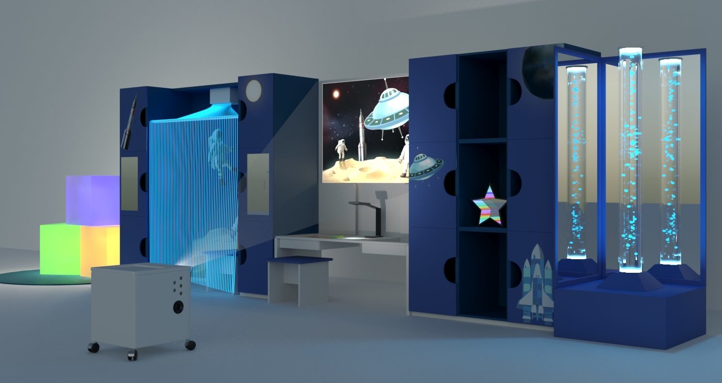 Сенсорный комплекс для кабинета психолога АЛМА "Космос" — тематический и функциональный комплект для психолога-дефектолога. Благодаря своему дизайну создает приятную атмосферу для обучения и выступает заменой для традиционной мебели в кабинете специалиста. Данные комплекты дополняются сенсорными комплектующими для психологической разгрузки.