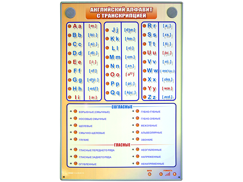Интерактивный стенд представляет собой панель c раздельной световой индикацией, на которой представлен английский алфавит с транскрипцией. Стенд снабжен программным обеспечением Виртуальный учитель. Управление работой стенда осуществляется с беспроводного пульта управления.