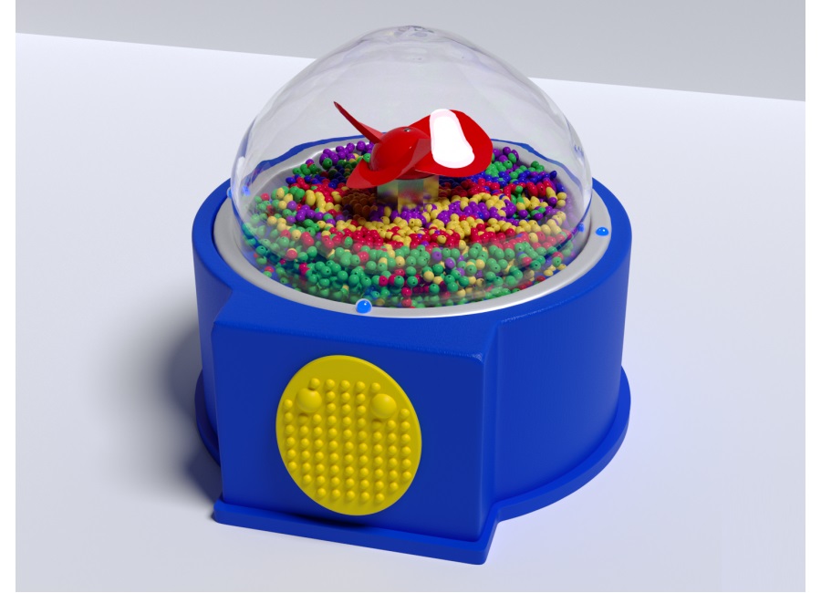 Необходимо нажать на кнопку, чтобы активировать устройство: заиграет музыка, засветятся лампочки и начнет крутиться вентилятор, поднимая вверх и закручивая в воздухе пространства под куполом лёгкие разноцветные шарики, в результате этого действия образуется лёгкий треск, похожий на шум дождя.