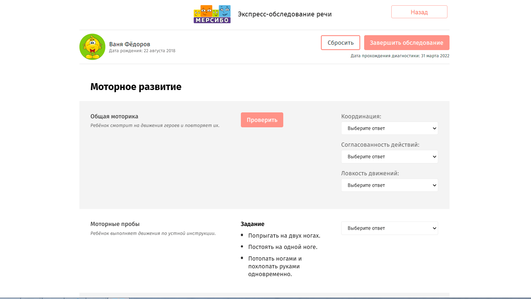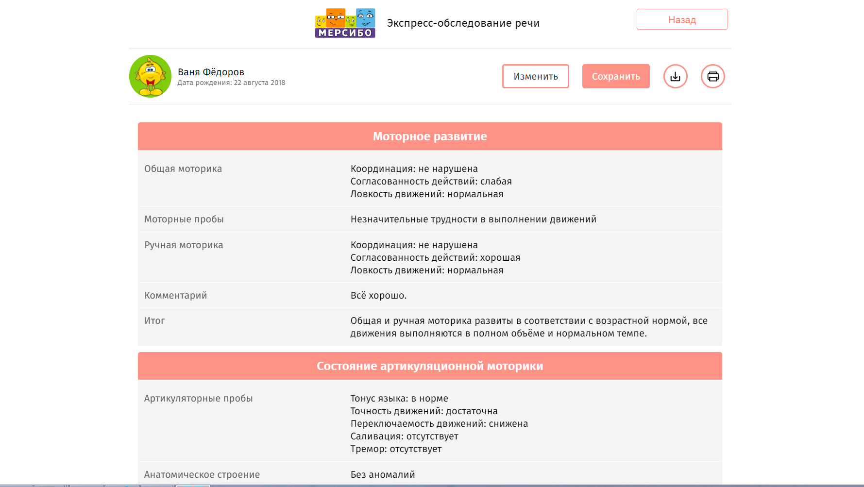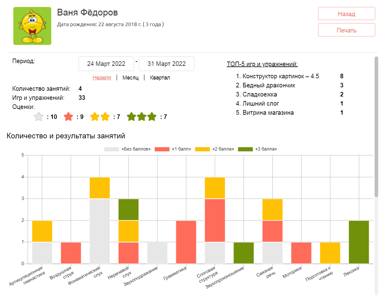 Эти данные специалист может использовать для наглядной отчетности при проверке, демонстрации результатов родителям, промежуточной корректировки плана занятий и наполнения собственного портфолио.