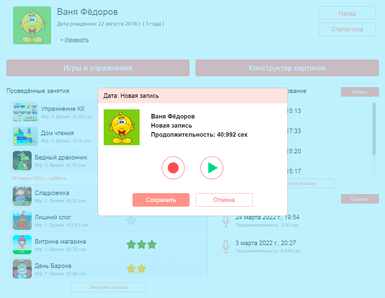 В программе удобно записывать речь ребенка: повторение фраз, стишков, скороговорок, чтение фрагментов, свободную речь. Записи хранятся в альбоме ребенка с отметкой даты создания.