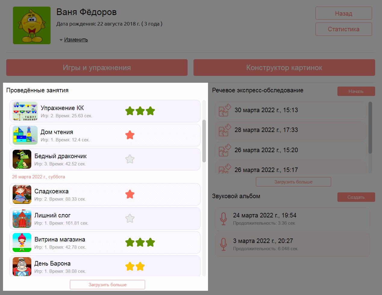 В Дневнике можно посмотреть историю занятий: когда ребенок занимался, во что играл, сколько по времени, хорошо ли справился.