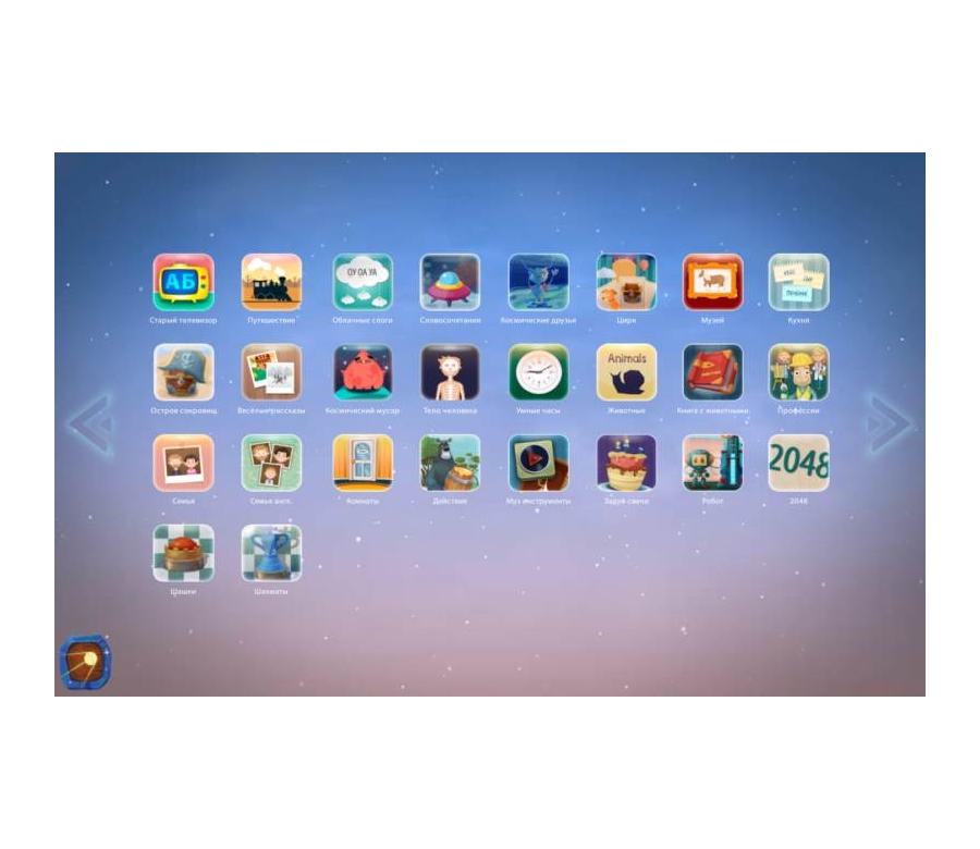 Уникальное программное обеспечение, включающее более 80 обучающих игр и 110 тестов, направленных на развитие памяти, внимания, логики, изучение счета и английского языка. Также в программное обеспечение входят приложения: рисование, раскраски, шахматы и шашки. Прохождение всех игр способствует расширению у ребенка знаний об окружающем его мире.