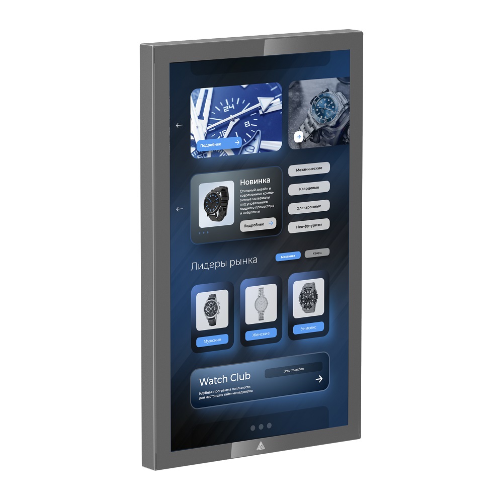Элегантный, стильный корпус из стали украсит холл любого офисного центра, музея или клиники. Сенсорный дисплей BM NEO GLASS 50" защищен фасадным стеклом, а разрешение Full HD позволит красиво и понятно показать посетителю наиболее полную информацию о компании, товарах, услугах, акциях, графике работы и т.д.