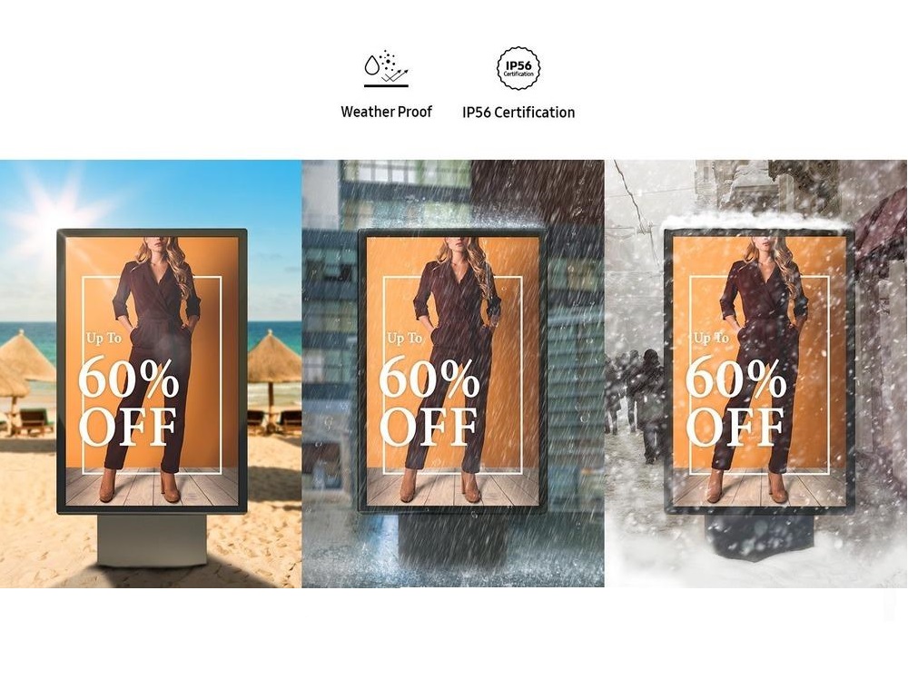 Погодоустойчивый телевизор OH85N-DK имеет два экрана для отображения контента с двух сторон. Яркость 3000нит на обеих сторонах дисплея обеспечивает удвоенную доставку информации в одном месте. Тонкий дизайн дисплея идеально подходит для автобусной остановки или уличных рекламных щитов.