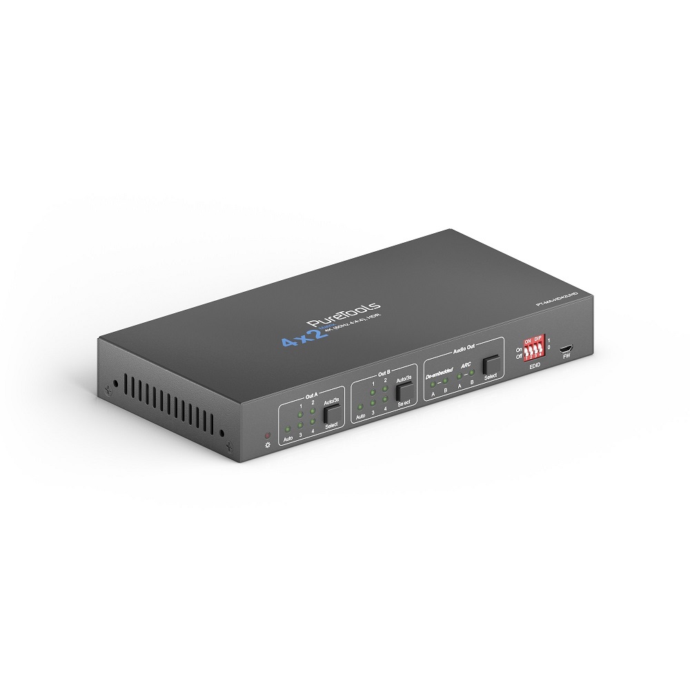 Матричный коммутатор PT-MA-HD44-UHD HDMI 4x2 из серии PureTools — это профессиональное решение для домашнего кинотеатра, распределения видеосигнала и цифровых вывесок, совместимое с новейшими источниками UltraHD и дисплеями, отображающими сигналы с разрешением до 4K (60 Гц). 4:4:4) с поддержкой HDR и пропускной способностью 18 Гбит/с.