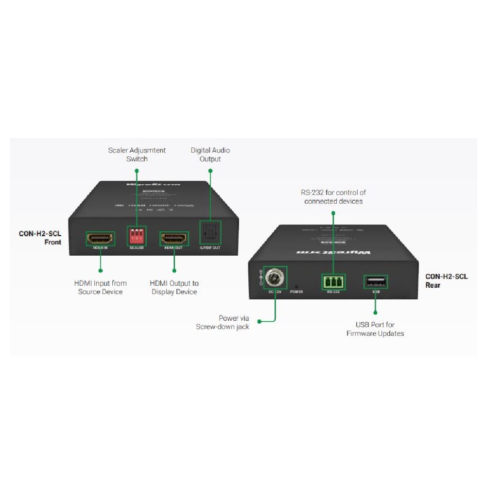 CON-H2-SCL - незаменимый инструмент при совмещении экранов 4K и 2K в одной системе распределения, он позволяет масштабировать HDMI-сигнал в линию. Сигнал HDMI от исходного устройства, DA или матрицы преобразуется таким образом, чтобы его мог принять подключенный дисплей. С помощью мощного чипа масштабирования сигнал 4K/60 4:4:4 или 4:2:0 может быть уменьшен до 480P; аналогичным образом сигнал может быть увеличен до 4K/60 4:4:4. Установка и настройка выполняется с помощью простого инструмента для ПК, который является частью WyreStorm Management Suite V1.6. Программный инструмент позволяет управлять функцией масштабирования и EDID через простой интерфейс.