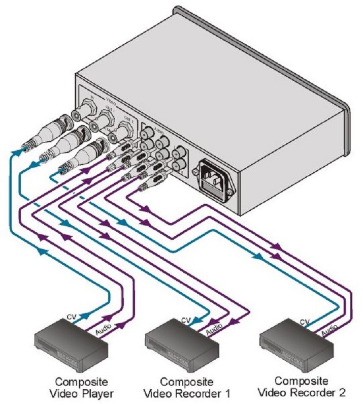 Входы и выходы видео - закрытого типа (разъемы BNC), звука - открытого типа (сдвоенные разъемы RCA). Звуковые входы позволяют принимать симметричный моносигнал, т. к. параметры устройства отвечают самым высоким требованиям. Устройство смонтировано в прочном и компактном корпусе. При помощи адаптера RK-1 два прибора VM-2N могут быть установлены в стандартную 19'' стойку.