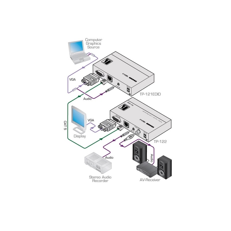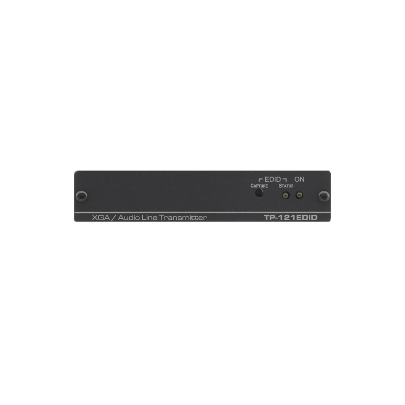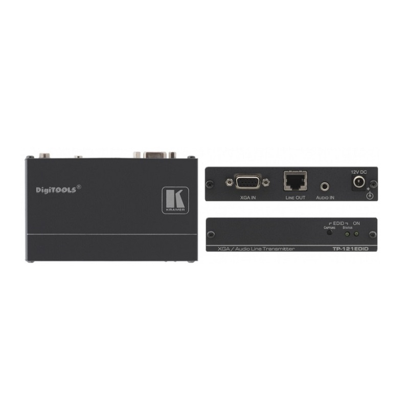 Kramer TP-121EDID – передатчик сигнала компьютерной графики и небалансного стереофонического аудиосигнала по витой паре. Прибор преобразует входные сигналы и передает их по витой паре на соответствующий приемник.