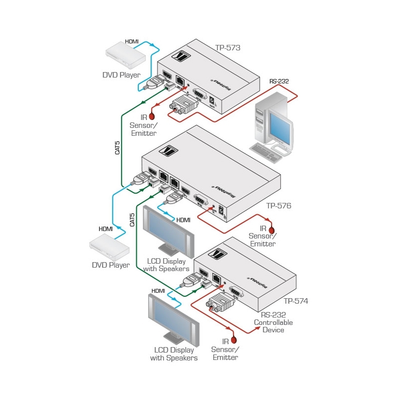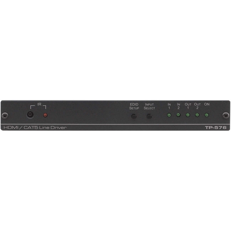 Kramer TP-576 - линейный передатчик сигнала HDMI, двунаправленных сигналов интерфейса RS-232 и сигналов инфракрасного управления по кабелю на витой паре. Прибор получает сигнал HDMI либо от местного источника, либо по витой паре от соответствующего передатчика, декодирует выбранный сигнал и выдает его на местные выходы HDMI, RS-232 и ИК, а также на выход для передачи по витой паре.