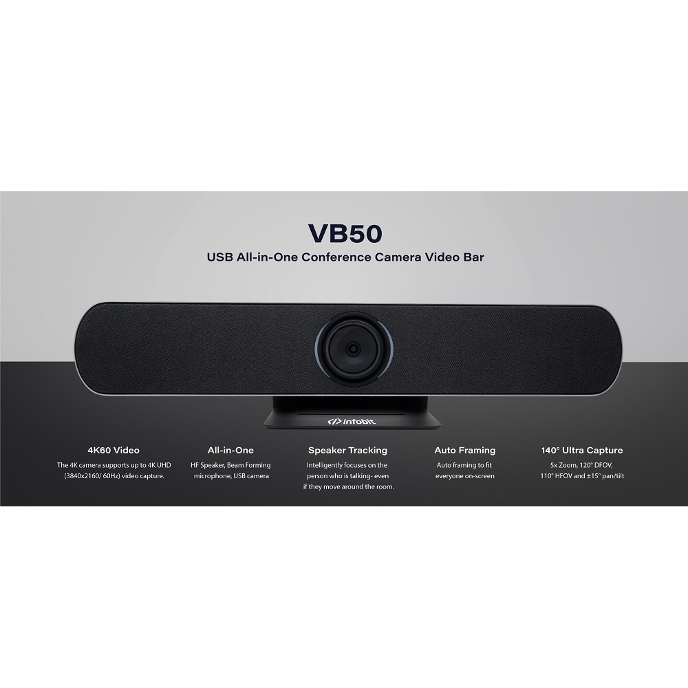 UHD-камера iCam VB50 динамически отслеживает динамики, чтобы держать их в кадре, и имеет сверхширокое поле зрения и 5-кратный цифровой зум для потрясающего и надежного видео. Микрофон с формированием луча гарантирует четкую и полную запись звука из любой точки помещения.