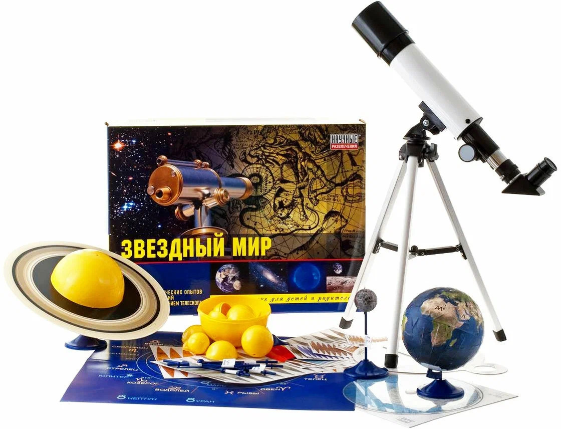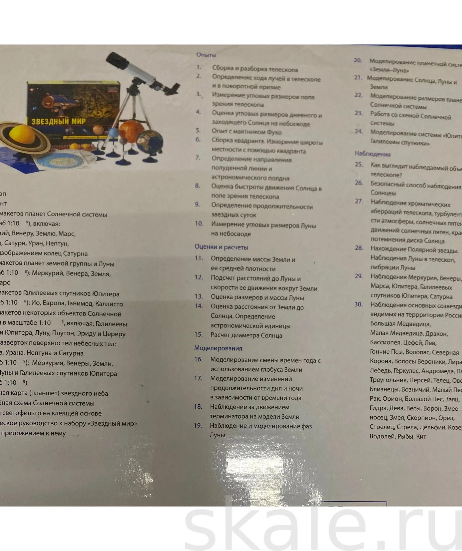 Набор позволяет собрать модель Солнечной Системы, провести 80 астрономических опытов и наблюдений с использованием телескопа.