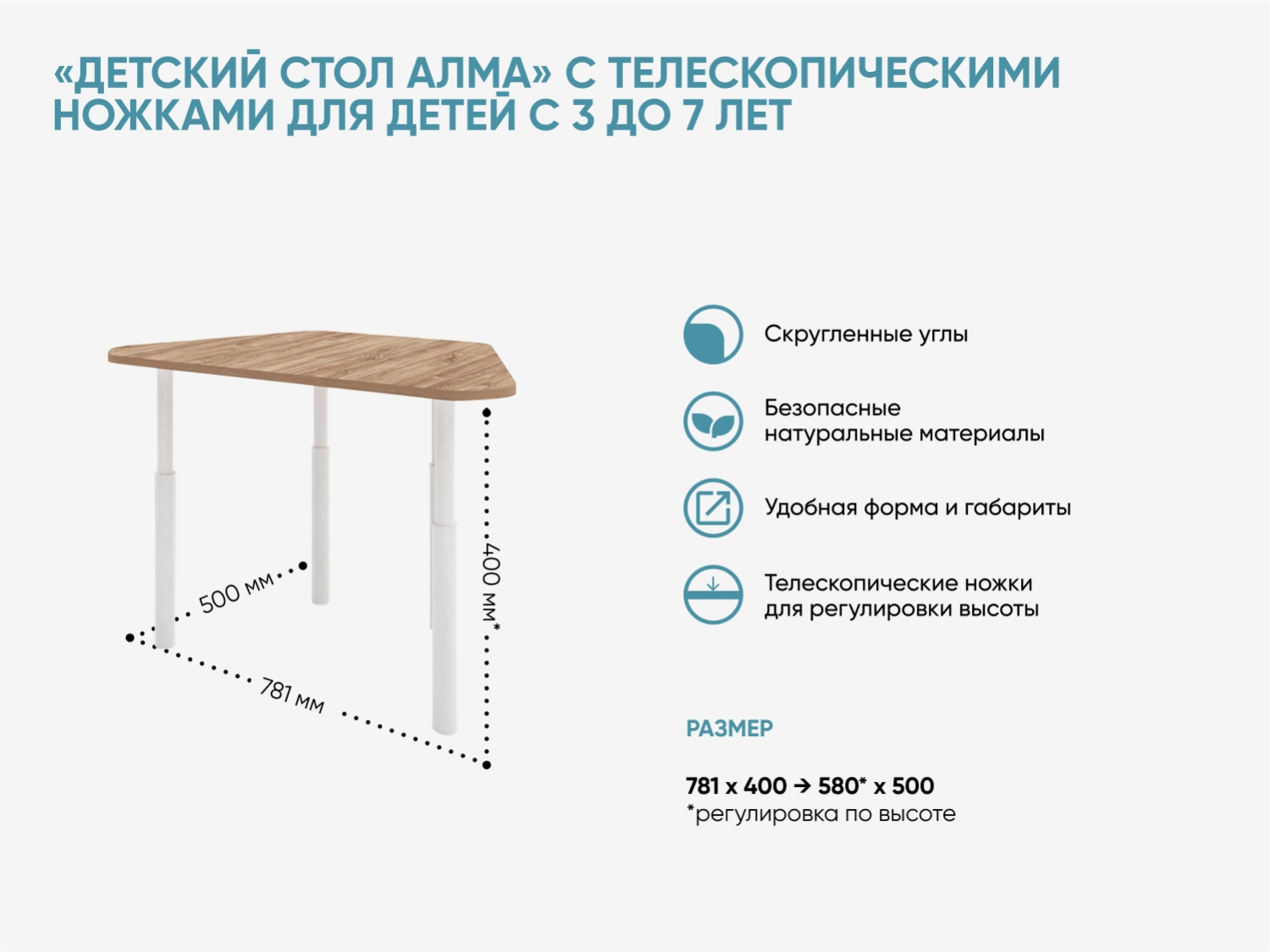 У детского стола «АЛМА» отсутствуют острые углы, что предотвращает травмирование детей. Изделие разработано с учетом анатомических и физиологических особенностей детей для их безопасности и комфорта.