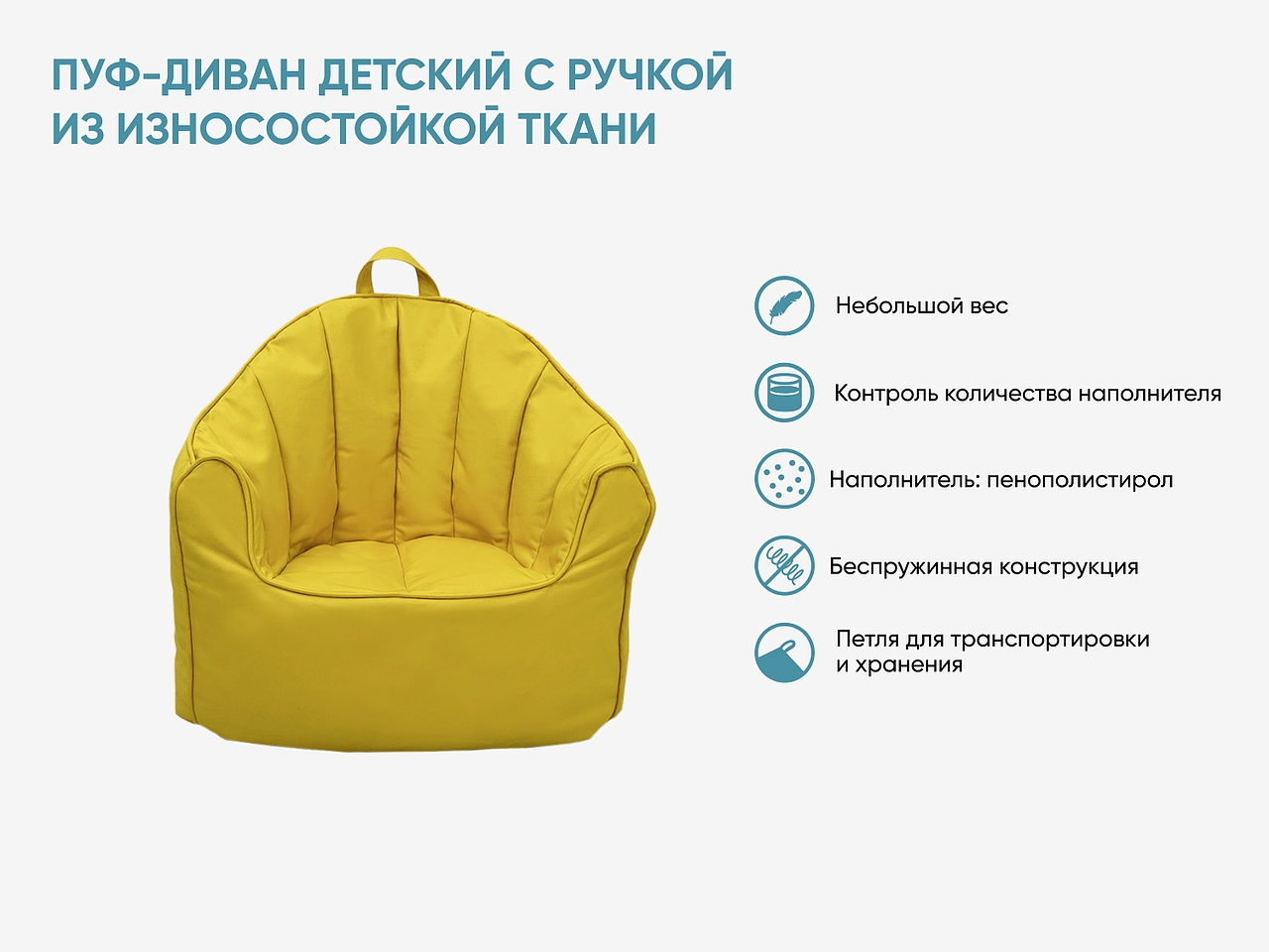 Конструкция в форме кресла с мягкой спинкой обеспечивает надежную поддержку и способствует формированию правильной посадки у ребенка. Отсутствие твердых поверхностей и острых углов делает пуф безопасным даже для малышей. Малый вес позволяет ребенку самостоятельно переносить его с места на место, а удобная ручка-петелька упрощает транспортировку и вертикальное хранение.