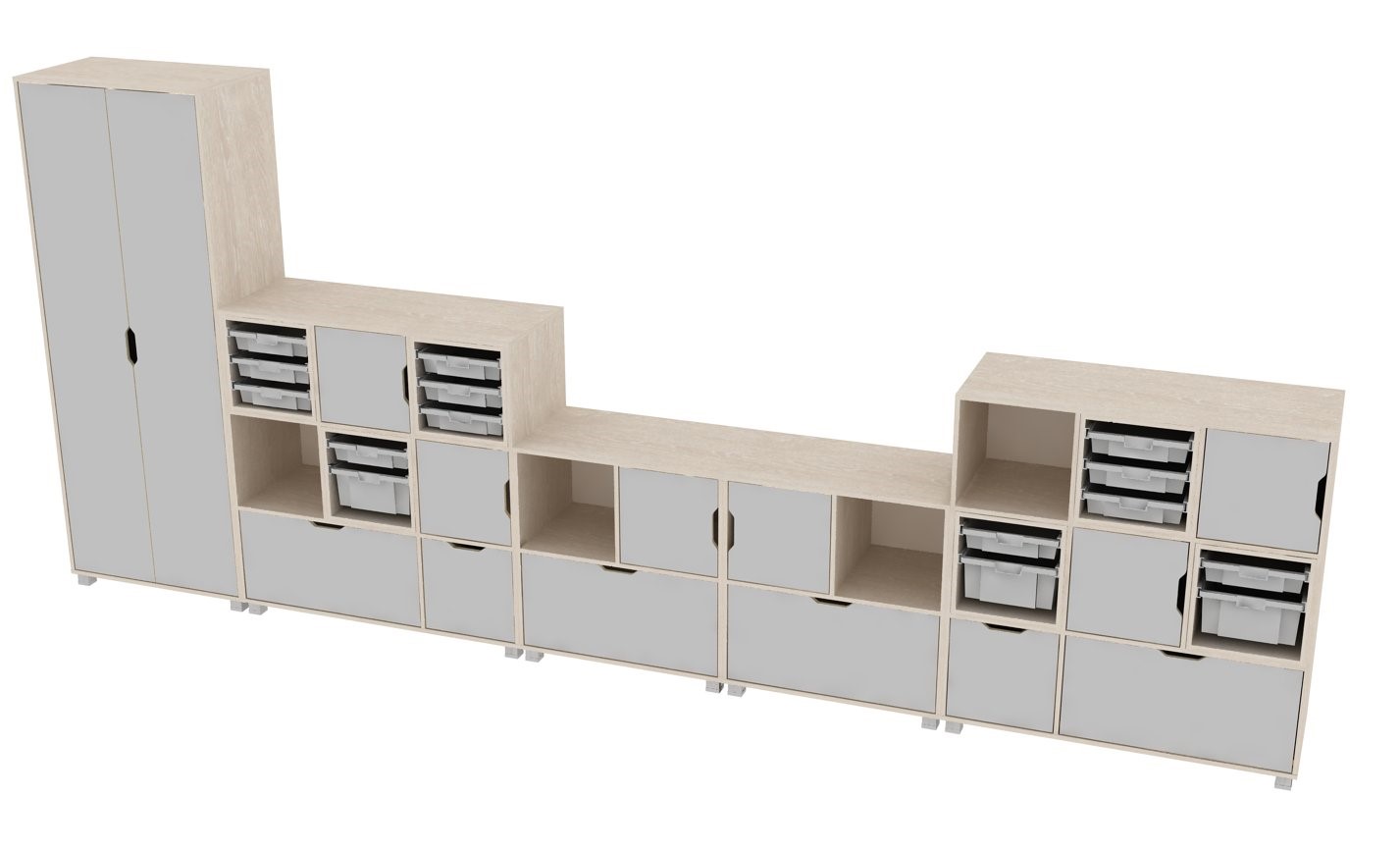 Все распашные фасады вкладные, установлены на четырехшарнирные петли и укомплектованы мебельными магнитами. На всех фасадах ручки-вырезы. Все модули устанавливаются на пластиковые регулируемые квадратные опоры.