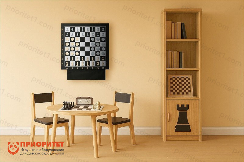 материал — фанера или ЛДСП, обработка безопасна для детей; в центре — фигура ладьи, объединяющая стиль кабинета.
