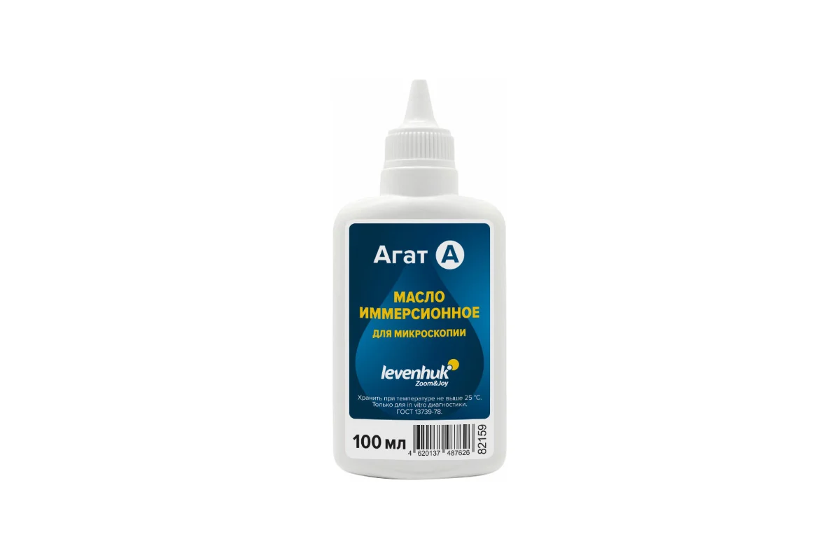 Levenhuk Агат А – классическое иммерсионное масло со стандартными вязкостью и коэффициентом пропускания, разработанное для микроскопов без систем визуализации (цифровых камер). Его можно применять для объективов всех методов исследования кроме люминесценции, но только тех, что поддерживают масляную иммерсию, т. е. объективов с пометкой «МИ» или «OIL». Нельзя использовать с сухими объективами. Масло необходимо для повышения светопропускания оптики и, как следствие, повышения четкости передаваемого изображения.
