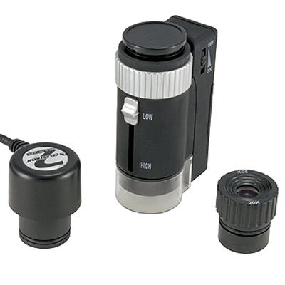 Этот портативный прибор совмещает в себе 2 устройства. У него единая оптическая часть (объектив) с двумя фиксированными положениями оптического увеличения (8х или 50х), но две сменных головки окуляра. Одна из них, это цифровая USB камера с разрешением 2 мегапикселя (1600х1200). Вторая - обычный оптический окуляр с дополнительным 20-кратным увеличением. В результате мы получаем возможность его использования и как компактного цифрового микроскопа, и как и традиционной аналоговой лупы.