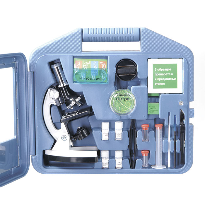 Микроскоп поставляется в крепком кейсе из ударопрочного пластика. Каждому аксессуару отведено свое место, а сам микроскоп надежно фиксируется внутри. Такой комплект удобно брать с собой в длительную поездку, на природу или на дачу.