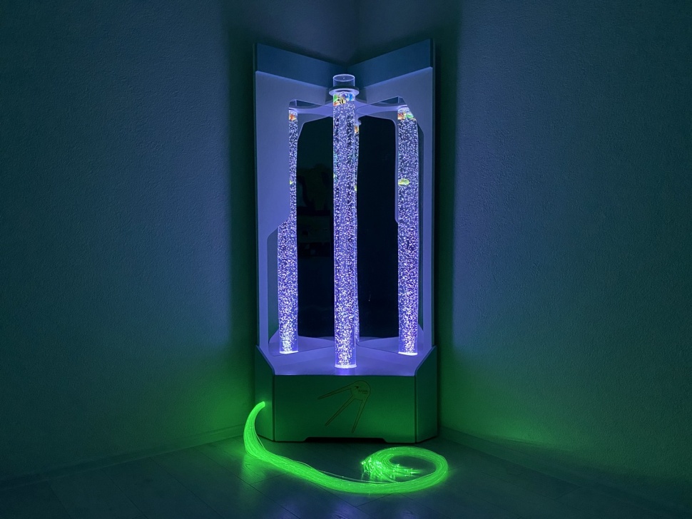 Угловая конструкция состоит из жёсткого основания, внутрь которого спрятан компрессор, подающий сжатый воздух, и открытой части с высоким воздушно-пузырьковым цилиндром и фонтаном из фибероптического волокна. Основание выполнено из экологичного МДФ и покрыто плёнкой ПВХ, устойчивой к повышенной влажности и ультрафиолетовым лучам. Такое покрытие не боится сколов, царапин, не выгорает на солнце и абсолютно безопасно для детей.