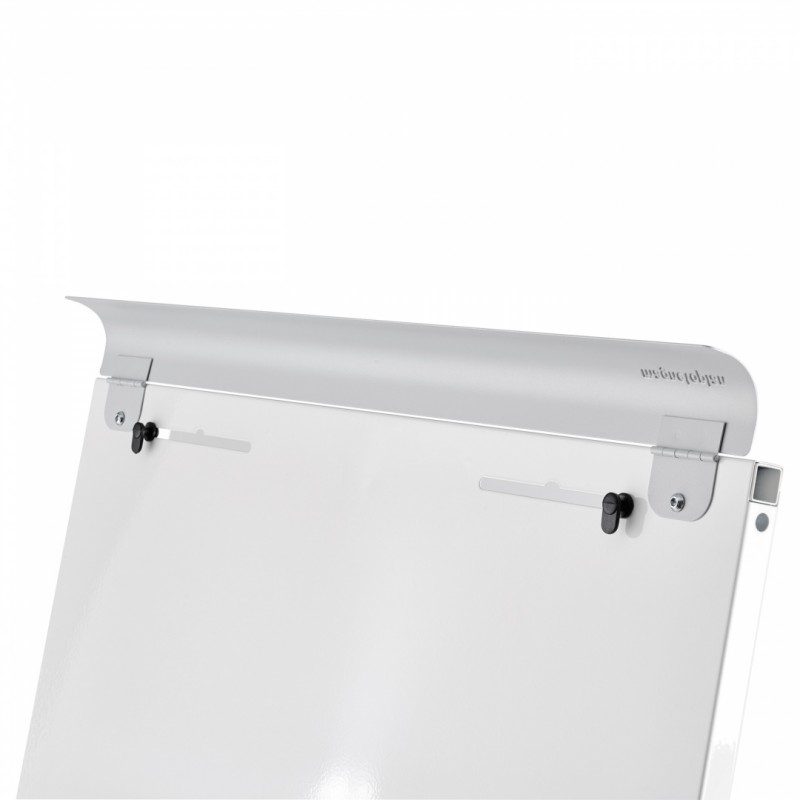 В верхней части флипчарта расположена прижимная планка для бумажных блоков. Блоки крепятся на держатели для бумаги, которые можно отрегулировать для использования с любыми бумажными блоками стандартного размера.