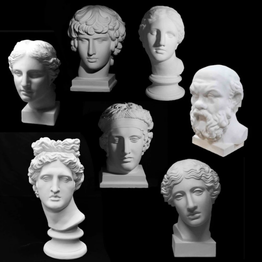 Комплект гипсовых моделей головы -7 шт (Голова Августа, Голова Венеры Милосской, Голова Гермеса, Голова Гаттамелата (Донателло), Голова Сократа, Голова Аполлона, Обрубовка по Гудону ЕК)