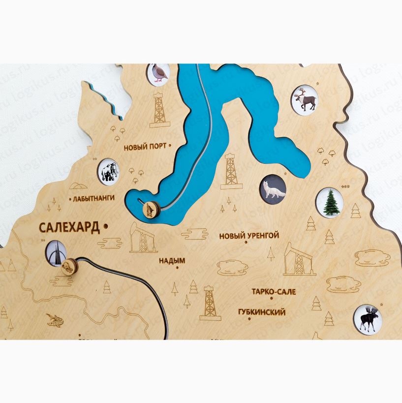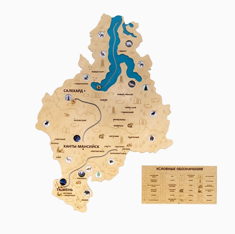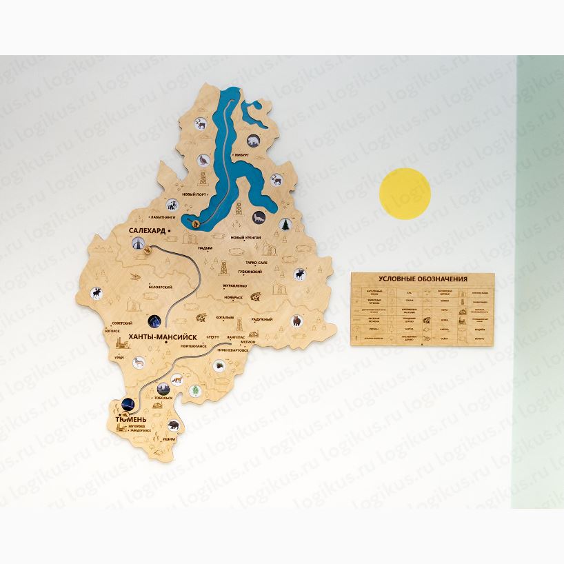 Декоративно-развивающая панель «Карта Тюменской области» для оформления интерьера. Знакомит дошкольников старшего возраста с флорой и фауной родного края, прививает любовь к своему региону.