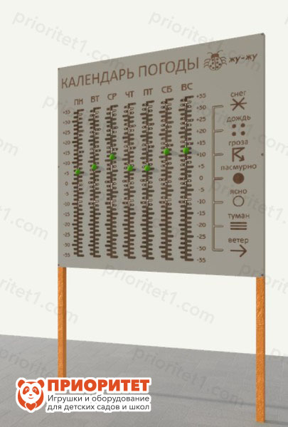 Стенд «Календарь погоды» - хорошее приобретение для юных метеорологов, которых интересуют вопросы климата и экологии. Данный стенд рекомендуется для установки на площадке детской метеостанции, но также может быть использован отдельно. Устанавливая на стенде нужные значения, дети научатся собирать и анализировать данные, делать простейшие расчёты, поймут принципы колебания температур в зависимости от времени года и иных климатических факторов, что способствует расширению кругозора. Рекомендуется для детей школьного возраста, а также в качестве учебного пособия на уроках окружающего мира в школах.