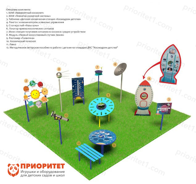 Космическая площадка «Мини» предназначена для обучения детей космической тематике: вместе ребята погружаются в тайны необъятного космоса, развивают воображение и находят верных друзей-исследователей. Отличается наличием только основных обучающих предметов – без атмосферной атрибутики в виде украшений.