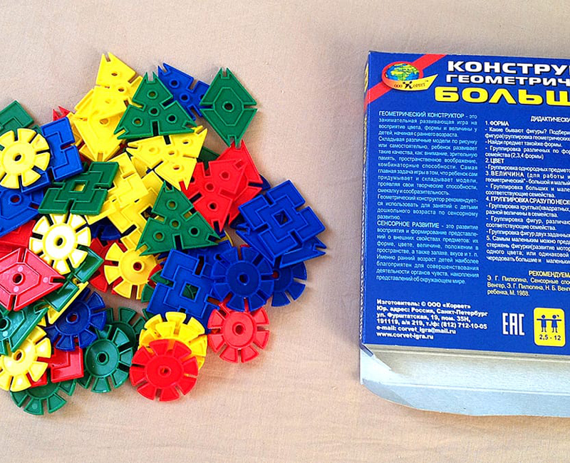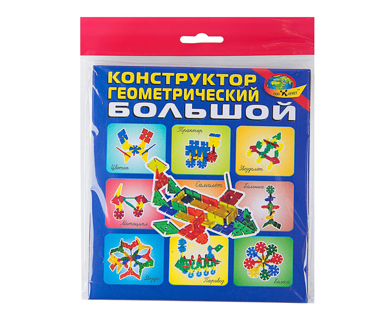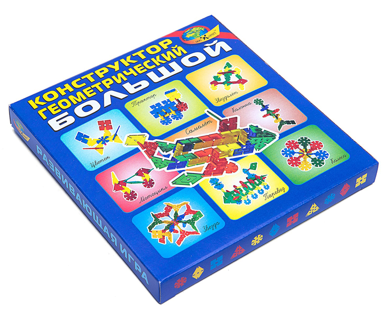 В комплект входят плоские геометрические фигуры (квадрат, ромб, треугольник, круг) с прорезями для соединения. Фигуры четырех цветов. Комплект конструктора отличается от «малого» большим размером и толщиной.