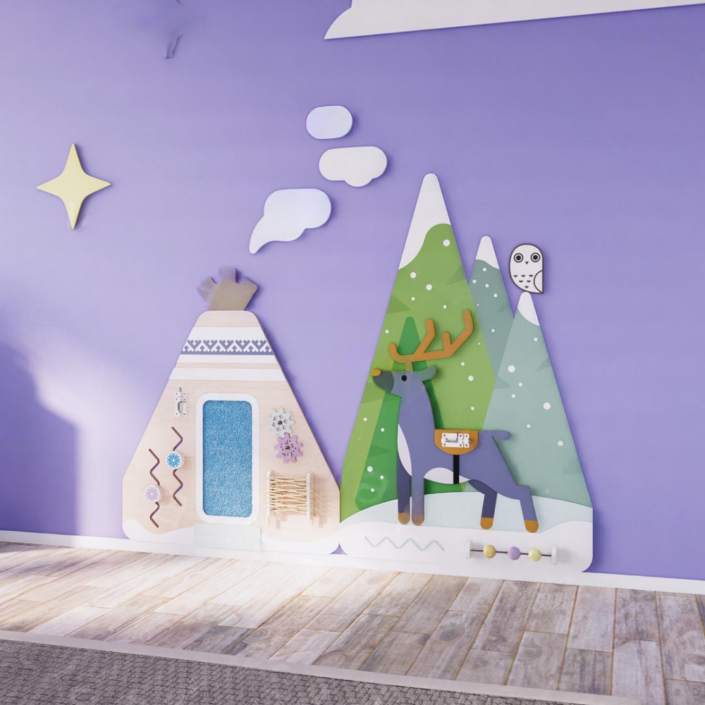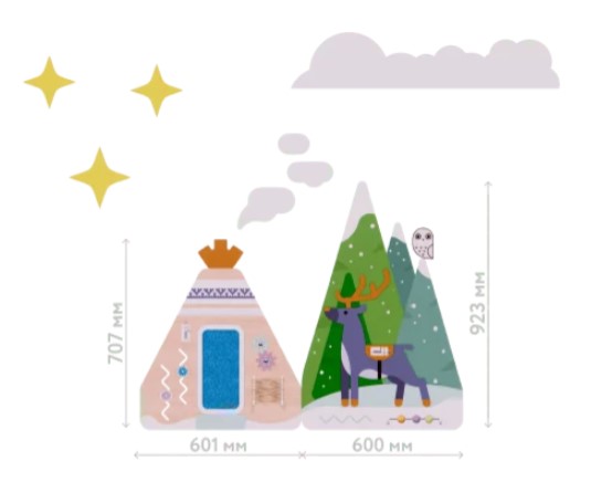 Красивая, аккуратно выполненная декоративно-развивающая панель «Северный край» познакомит детей с обитателями и культурой этого региона страны. Панель представлена несколькими элементами в виде чума, деревьев, северного оленя и полярной совы, а в нижней части расположены интерактивные элементы для развития мелкой моторики, логического мышления и понимания причинно-следственных связей.