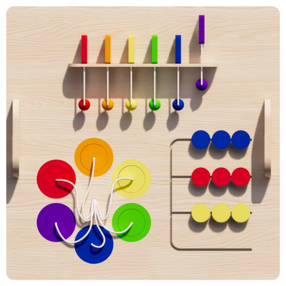 Панель с разноцветными элементами позволит развить зрительное восприятие, закрепить представления об основных цветах, восприятие цвета на расстоянии и умение классифицировать и сравнивать предметы по признаку.