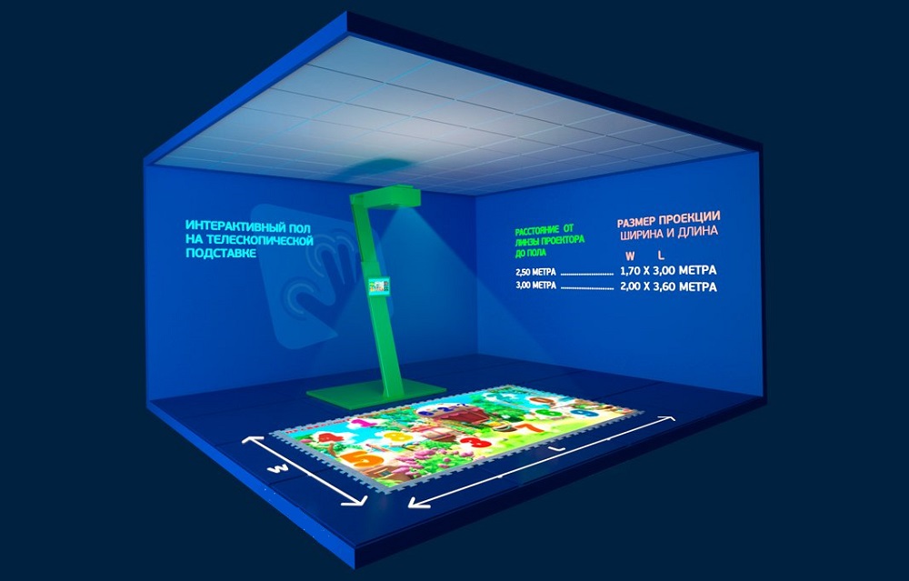 Интерактивный пол Interactive Project Чудознайка на телескопической подставке, представляет собой сочетание современных цифровых и проекционных технологий, позволяющих кардинально изменить интерьер практически любого помещения и создать необычайное видео на полу.