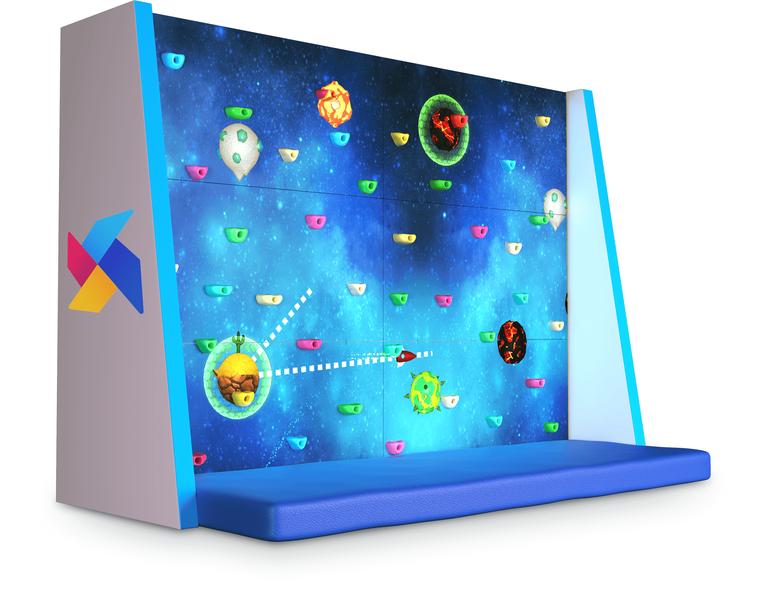 Интерактивный скалодром – стена, оборудованная выступами для лазания и меняющая свой дизайн в зависимости от выбора игры. Мы обеспечили безопасность эксплуатации скалодрома специальными матами и страховками.