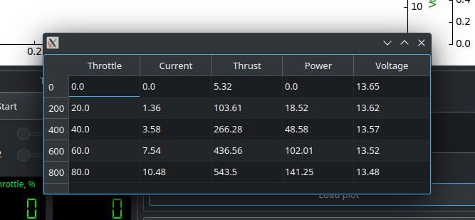 3. При использовании DShot регуляторов оборотов стенд дополнительно показывает RPM (обороты/минуту).
