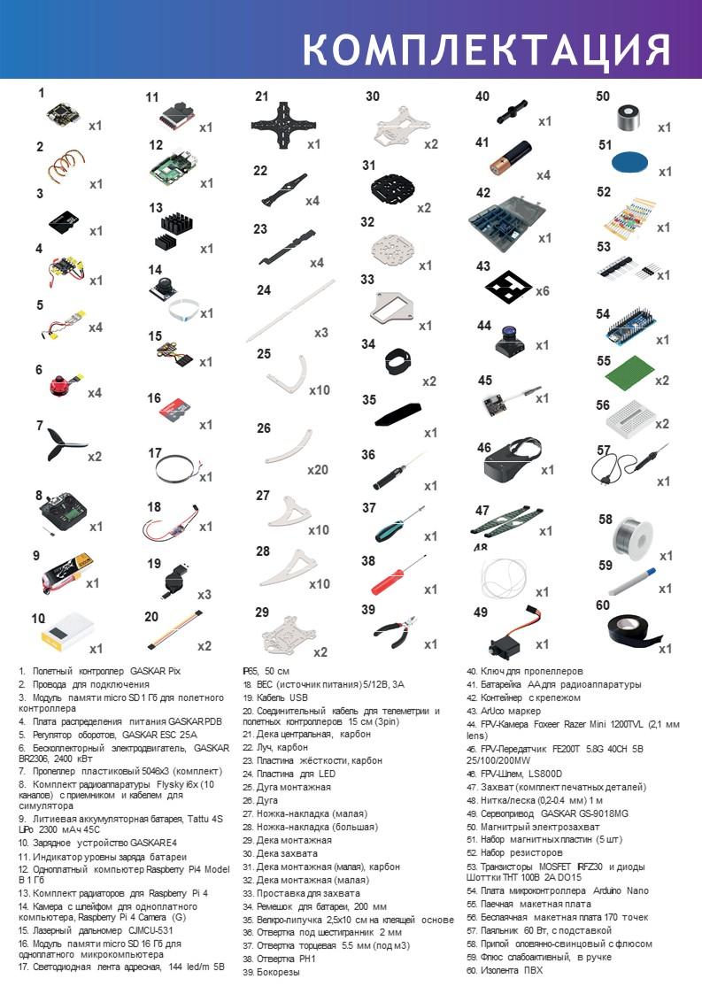 Конструктор программируемого квадрокоптера «Клевер Про» представляет собой комплексное решение для сборки, пайки, настройки и эксплуатации БАС. Комплект включает в себя все необходимые для этого компоненты: полный набор комплектующих для сборки квадрокоптера Клевер, специализированный инструментарий, включая пульт, FPV-очки, паяльное оборудование, лицензионное программное обеспечение, а также подробные методические материалы по сборке и запуску. Отсутствует необходимость в приобретении дополнительных деталей или компонентов, так как все требуемые элементы системы поставляются в рамках базовой конфигурации комплекта. Прилагаемые методические материалы обеспечивают стандартизированный и понятный процесс сборки устройства, его программирования и эксплуатации.