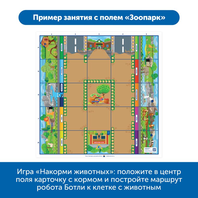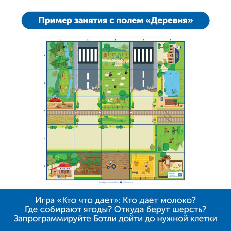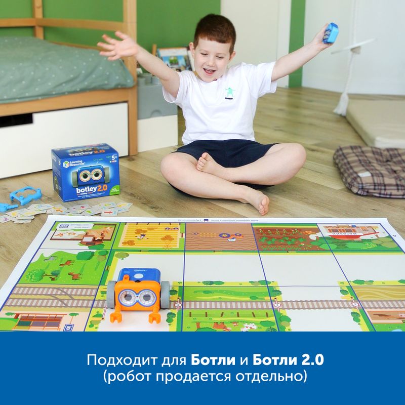 Комплект полей Learning Resources RB5002 является дополнительным аксессуаром для робота Ботли и Ботли 2.0. Работа с полями позволяет освоить навыки программирования и кодирования при параллельном интерактивном изучении окружающего мира в четырех аспектах: профессии, виды животных, объекты действительности, пространственное ориентирование.