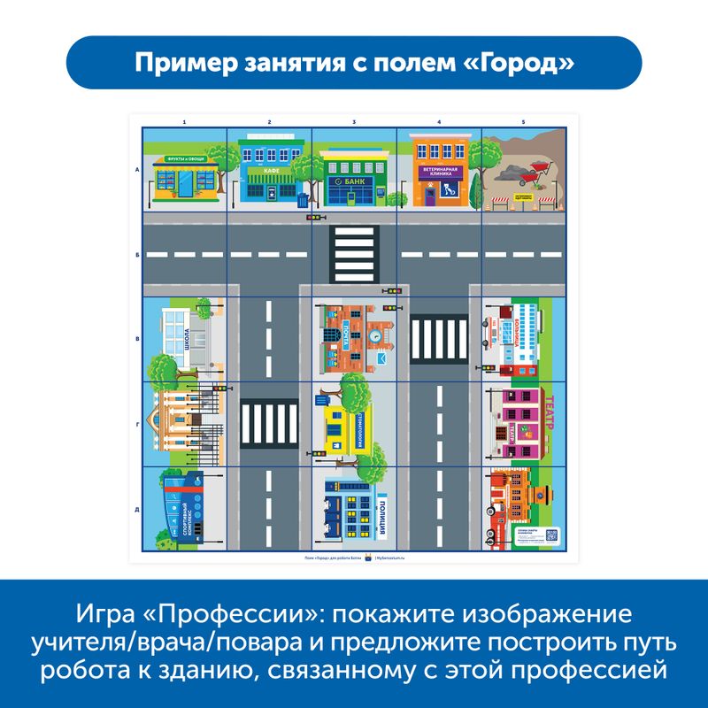 Тематическое поле «Город» позволяет программировать маршруты Ботли с учетом дорожным знаков и изучить соответствующие профессии.