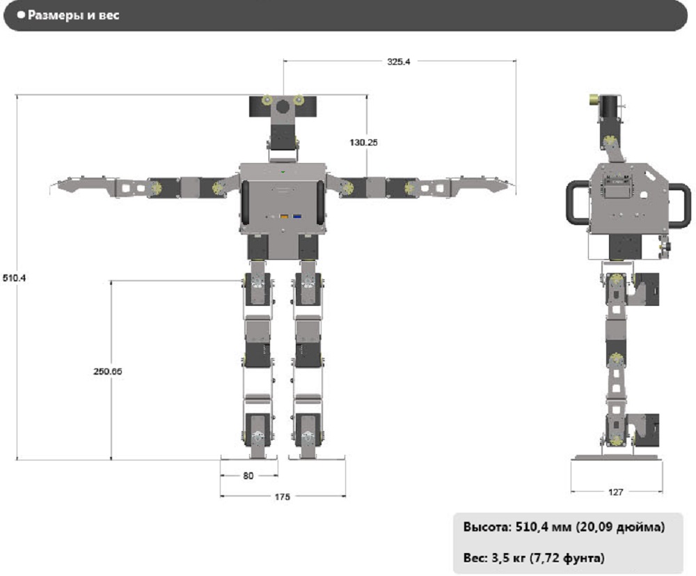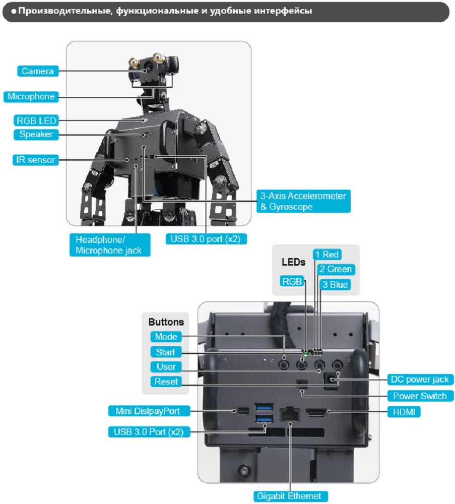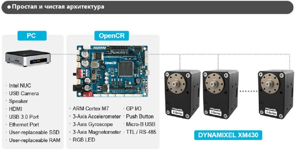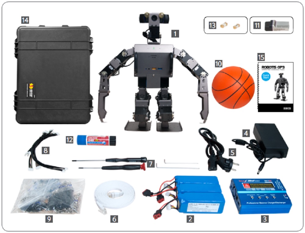 Человекоподобный робот ROBOTIS DARwIn-OP3 работает на базе открытой платформы и подходит для научно-исследовательской деятельности. Робот обладает 20 сервоприводами Dynamixel, системой технического зрения и встроенным ПК на базе процессора Intel.