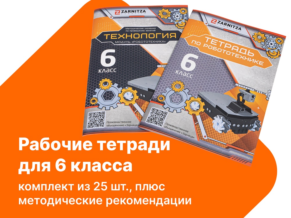 Комплект рабочих тетрадей Zarnitza предназначен для наиболее тщательного и глубокого усвоения знаний учащимися 6 класса по цифровым технологиям (робототехнике, электронике, программированию) на уроке Труд (технология).