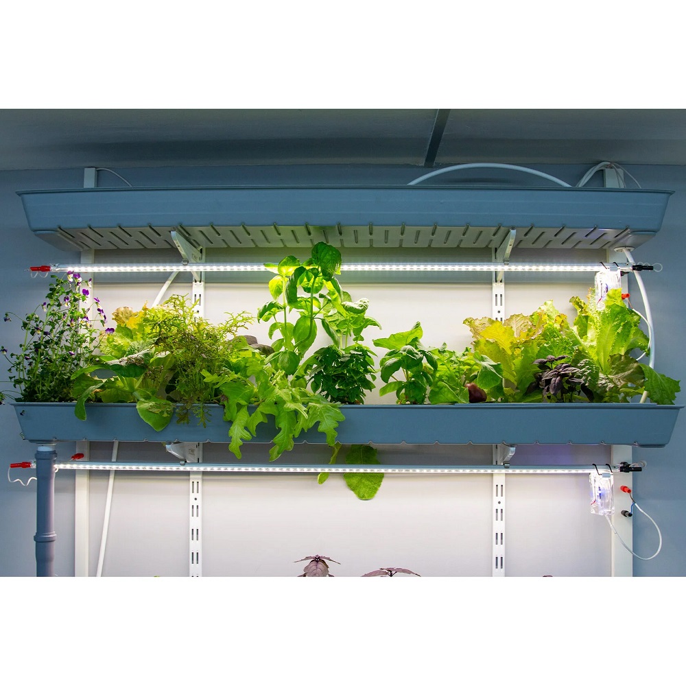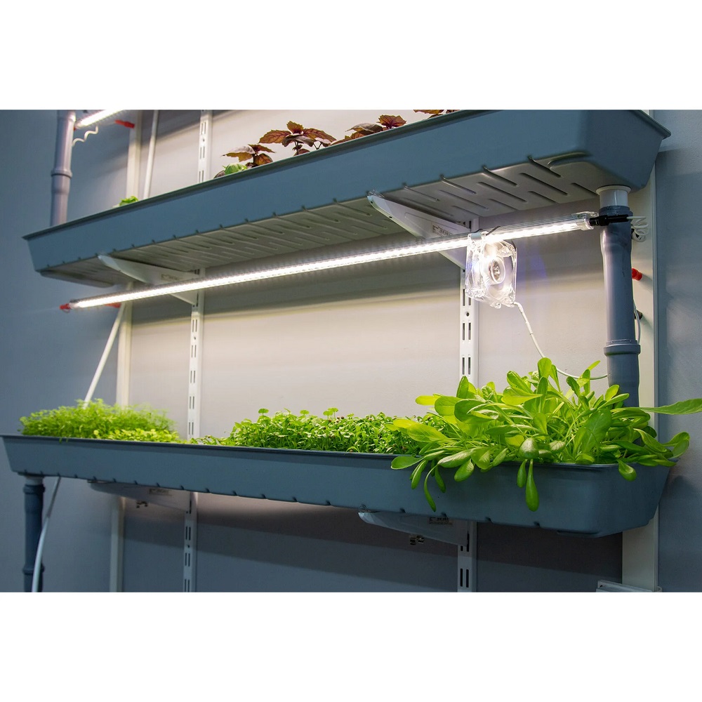 • 3 энергоэффективных фито-светильника длиной 117 см (156 полно спектральных светодиодов и 30 с длиной волны 625 Нм–красный цвет) 25 Вт, 12 В. Система лёгкого, без использования инструментов, изменения количества, высоты подвеса и направления светового потока на каждом этаже