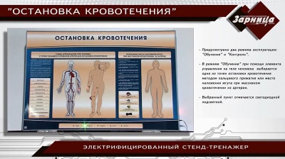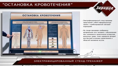 Электрифицированный стенд-тренажер Zarnitza "Остановка кровотечения" представляет собой полноцветную информационную панель с комбинированной световой индикацией. На стенде-тренажере изображена артериальная сеть человека с обозначением мест возможного кровотечения вследствие различных травм, точек пережатия артерий для быстрой остановки кровотечения и областей наложения жгутов.